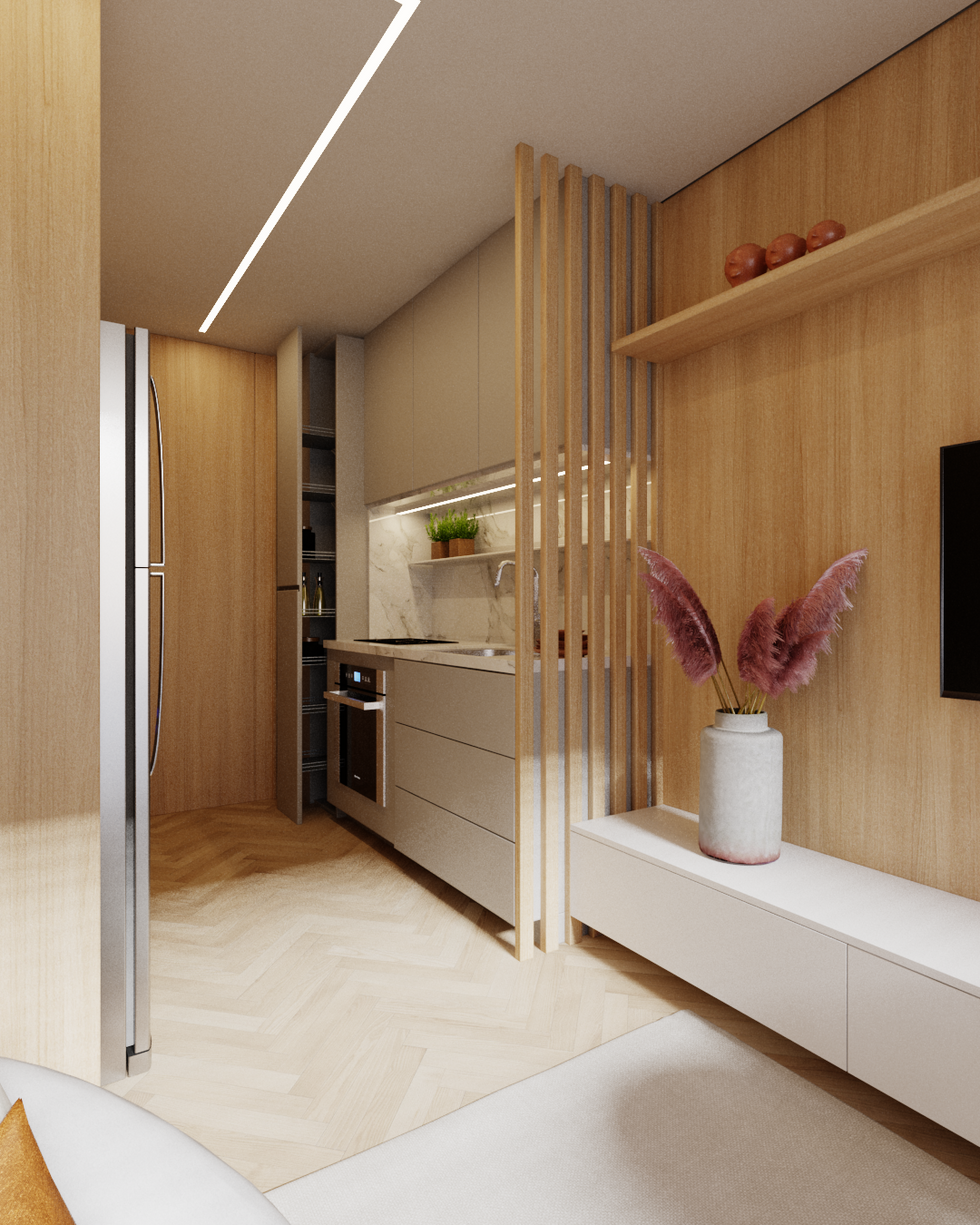 Com uma paleta de cores quentes e o uso de materiais amadeirados, o loft oferece uma atmosfera acolhedora e contemporânea.